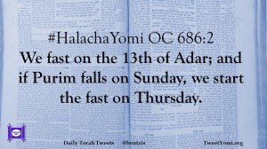 HalachaYomi #HalachaYomi OC 686:2 Date: March 10, 2020Author: ysspitz #HalachaYomi OC 686:2 We fast on the 13th of Adar; and if Purim falls on Sunday, we start the fast on Thursday. Share this: Share on X (Opens in new window) X Share on Facebook (Opens in new window) Facebook Like Loading... Related