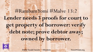 #RambamYomi #Malve 13:2 Lender needs 3 proofs for court to get property of borrower: verify debt note; prove debtor away; owned by borrower.