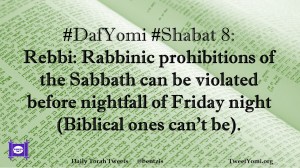 DafYomi, Shabat #DafYomi #Shabat 8 Date: March 13, 2020Author: ysspitz #DafYomi #Shabat 8: Rebbi: Rabbinic prohibitions of the Sabbath can be violated before nightfall of Friday night (Biblical ones can’t be). Share this: Share on X (Opens in new window) X Share on Facebook (Opens in new window) Facebook Like Loading... Related