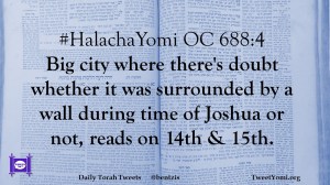 #HalachaYomi OC 688:4 Big city where there’s doubt whether it was surrounded by a wall during time of Joshua or not, reads on 14th & 15th.