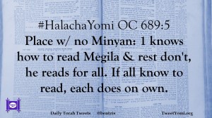 #HalachaYomi OC 689:5 Place w/ no Minyan: 1 knows how to read Megila & rest don’t, he reads for all. If all know to read, each does on own.