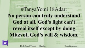 #TanyaYomi 18Adar: No person can truly understand God at all. God’s light can’t reveal itself except by doing Mitzvot, God’s will & wisdom.