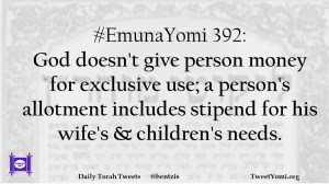#EmunaYomi 392: God doesn’t give person money for exclusive use; a person’s allotment includes stipend for his wife’s & children’s needs.