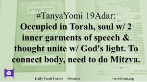 #TanyaYomi 19Adar: Occupied in Torah, soul w/ 2 inner garments of speech & thought unite w/ God’s light. To connect body, need to do Mitzva.