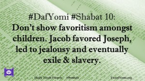DafYomi, Shabat #DafYomi #Shabat 10 Date: March 17, 2020Author: ysspitz #DafYomi #Shabat 10: Don’t show favoritism amongst children. Jacob favored Joseph, led to jealousy and eventually exile & slavery. Share this: Share on X (Opens in new window) X Share on Facebook (Opens in new window) Facebook Like Loading... Related