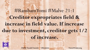 #RambamYomi #Malve 21:1 Creditor expropriates field & increase in field value. If increase due to investment, creditor gets 1/2 of increase.
