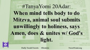 #TanyaYomi 20Adar: When mind tells body to do Mitzva, animal soul submits unwillingly to holiness, says Amen, does & unites w/ God’s light.