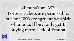 #EmunaYomi 397: Lottery tickets are permissible, but not 100% congruent w/ spirit of Emuna. If buy, only get 1. Buying more, lack of Emuna.