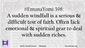 #EmunaYomi 398: A sudden windfall is a serious & difficult test of faith. Often lack emotional & spiritual gear to deal with sudden riches.