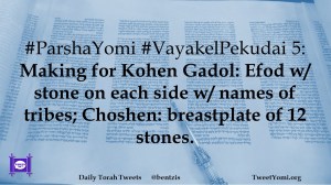 #ParshaYomi #VayakelPekudai 5: Making for Kohen Gadol: Efod w/ stone on each side w/ names of tribes; Choshen: breastplate of 12 stones.