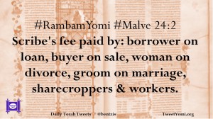 #RambamYomi #Malve 24:2 Scribe’s fee paid by: borrower on loan, buyer on sale, woman on divorce, groom on marriage, sharecroppers & workers.