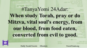 #TanyaYomi 24Adar: When study Torah, pray or do Mitzva, vital soul’s energy, from our blood, from food eaten, converted from evil to good.