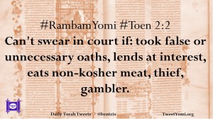 #RambamYomi #Toen 2:2 Can’t swear in court if: took false or unnecessary oaths, lends at interest, eats non-kosher meat, thief, gambler.