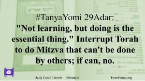 #TanyaYomi 29Adar: “Not learning, but doing is the essential thing.” Interrupt Torah to do Mitzva that can’t be done by others; if can, no.