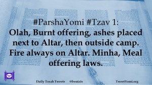 #ParshaYomi #Tzav 1: Olah, Burnt offering, ashes placed next to Altar, then outside camp. Fire always on Altar. Minha, Meal offering laws.