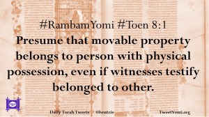#RambamYomi #Toen 8:1 Presume that movable property belongs to person with physical possession, even if witnesses testify belonged to other.