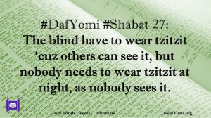 DafYomi, Shabat #DafYomi #Shabat 27 Date: April 2, 2020Author: ysspitz #DafYomi #Shabat 27: The blind have to wear tzitzit ‘cuz others can see it, but nobody needs to wear tzitzit at night, as nobody sees it. Share this: Share on X (Opens in new window) X Share on Facebook (Opens in new window) Facebook Like Loading... Related