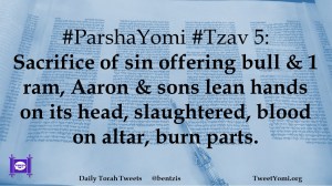 #ParshaYomi #Tzav 5: Sacrifice of sin offering bull & 1 ram, Aaron & sons lean hands on its head, slaughtered, blood on altar, burn parts.