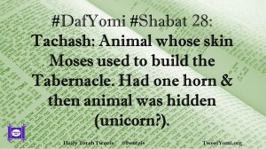DafYomi, Shabat #DafYomi #Shabat 28 Date: April 3, 2020Author: ysspitz #DafYomi #Shabat 28: Tachash: Animal whose skin Moses used to build the Tabernacle. Had one horn & then animal was hidden (unicorn?). Share this: Share on X (Opens in new window) X Share on Facebook (Opens in new window) Facebook Like Loading... Related