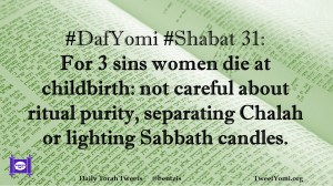 DafYomi, Shabat #DafYomi #Shabat 31 Date: April 7, 2020Author: ysspitz #DafYomi #Shabat 31: For 3 sins women die at childbirth: not careful about ritual purity, separating Chalah or lighting Sabbath candles. Share this: Share on X (Opens in new window) X Share on Facebook (Opens in new window) Facebook Like Loading... Related