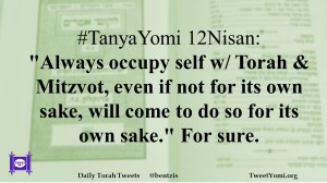 #TanyaYomi 12Nisan: “Always occupy self w/ Torah & Mitzvot, even if not for its own sake, will come to do so for its own sake.” For sure.