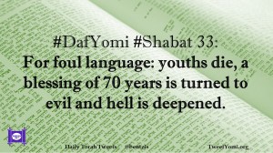 DafYomi, Shabat #DafYomi #Shabat 33 Date: April 8, 2020Author: ysspitz #DafYomi #Shabat 33: For foul language: youths die, a blessing of 70 years is turned to evil and hell is deepened. Share this: Share on X (Opens in new window) X Share on Facebook (Opens in new window) Facebook Like Loading... Related