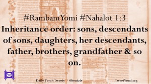 #RambamYomi #Nahalot 1:3 Inheritance order: sons, descendants of sons, daughters, her descendants, father, brothers, grandfather & so on.