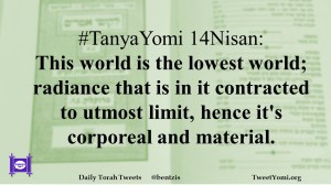 #TanyaYomi 14Nisan: This world is the lowest world; radiance that is in it contracted to utmost limit, hence it’s corporeal and material.