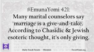 #EmunaYomi 421: Many marital counselors say marriage is a give-and-take. According to Chasidic & Jewish esoteric thought, it’s only giving.