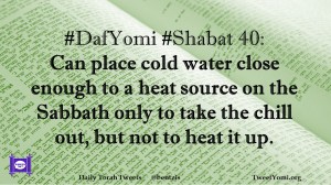 DafYomi, Shabat #DafYomi #Shabat 40 Date: April 14, 2020Author: ysspitz #DafYomi #Shabat 40: Can place cold water close enough to a heat source on the Sabbath only to take the chill out, but not to heat it up. Share this: Share on X (Opens in new window) X Share on Facebook (Opens in new window) Facebook Like Loading... Related