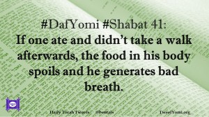 DafYomi, Shabat #DafYomi #Shabat 41 Date: April 14, 2020Author: ysspitz #DafYomi #Shabat 41: If one ate and didn’t take a walk afterwards, the food in his body spoils and he generates bad breath. Share this: Share on X (Opens in new window) X Share on Facebook (Opens in new window) Facebook Like Loading... Related