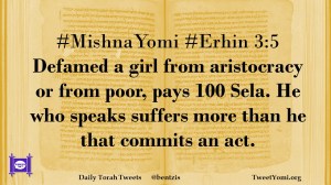 #MishnaYomi #Erhin 3:5 Defamed a girl from aristocracy or from poor, pays 100 Sela. He who speaks suffers more than he that commits an act.