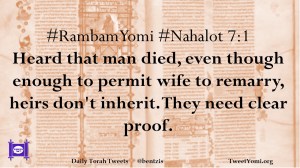 #RambamYomi #Nahalot 7:1 Heard that man died, even though enough to permit wife to remarry, heirs don’t inherit. They need clear proof.