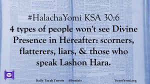 #HalachaYomi KSA 30:6 4 types of people won’t see Divine Presence in Hereafter: scorners, flatterers, liars, & those who speak Lashon Hara.