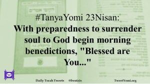 TanyaYomi #TanyaYomi 23Nisan Date: April 17, 2020Author: ysspitz #TanyaYomi 23Nisan: With preparedness to surrender soul to God begin morning benedictions, “Blessed are You…” Share this: Share on X (Opens in new window) X Share on Facebook (Opens in new window) Facebook Like Loading... Related
