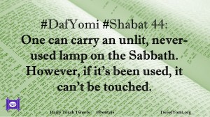 DafYomi, Shabat #DafYomi #Shabat 44 Date: April 20, 2020Author: ysspitz #DafYomi #Shabat 44: One can carry an unlit, never-used lamp on the Sabbath. However, if it’s been used, it can’t be touched. Share this: Share on X (Opens in new window) X Share on Facebook (Opens in new window) Facebook Like Loading... Related