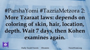 #ParshaYomi #TazriaMetzora 2: More Tzaraat laws: depends on coloring of skin, hair, location, depth. Wait 7 days, then Kohen examines again.