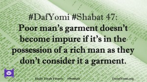 DafYomi, Shabat #DafYomi #Shabat 47 Date: April 22, 2020Author: ysspitz #DafYomi #Shabat 47: Poor man’s garment doesn’t become impure if it’s in the possession of a rich man as they don’t consider it a garment. Share this: Share on X (Opens in new window) X Share on Facebook (Opens in new window) Facebook Like Loading... Related