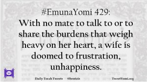 #EmunaYomi 429: With no mate to talk to or to share the burdens that weigh heavy on her heart, a wife is doomed to frustration, unhappiness.
