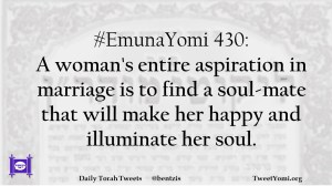#EmunaYomi 430: A woman’s entire aspiration in marriage is to find a soul-mate that will make her happy and illuminate her soul.