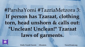 #ParshaYomi #TazriaMetzora 3: If person has Tzaraat, clothing torn, head unshorn & calls out: “Unclean! Unclean!” Tzaraat laws of garments.