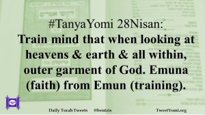 #TanyaYomi 28Nisan: Train mind that when looking at heavens & earth & all within, outer garment of God. Emuna (faith) from Emun (training).