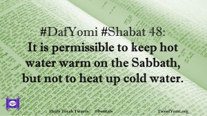 DafYomi, Shabat #DafYomi #Shabat 48 Date: April 23, 2020Author: ysspitz #DafYomi #Shabat 48: It is permissible to keep hot water warm on the Sabbath, but not to heat up cold water. Share this: Share on X (Opens in new window) X Share on Facebook (Opens in new window) Facebook Like Loading... Related
