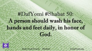 DafYomi, Shabat #DafYomi #Shabat 50 Date: April 24, 2020Author: ysspitz #DafYomi #Shabat 50: A person should wash his face, hands and feet daily, in honor of God. Share this: Share on X (Opens in new window) X Share on Facebook (Opens in new window) Facebook Like Loading... Related