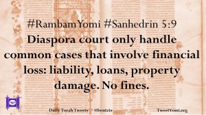 #RambamYomi #Sanhedrin 5:9 Diaspora court only handle common cases that involve financial loss: liability, loans, property damage. No fines.
