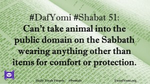 DafYomi, Shabat #DafYomi #Shabat 51 Date: April 26, 2020Author: ysspitz #DafYomi #Shabat 51: Can’t take animal into the public domain on the Sabbath wearing anything other than items for comfort or protection. Share this: Share on X (Opens in new window) X Share on Facebook (Opens in new window) Facebook Like Loading... Related