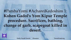 #ParshaYomi #AchareiKedoshim 1: Kohen Gadol’s Yom Kipur Temple procedure. Sacrifices, bathing, change of garb, scapegoat killed in desert.