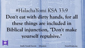 #HalachaYomi KSA 33:9 Don’t eat with dirty hands, for all these things are included in Biblical injunction, “Don’t make yourself repulsive.”