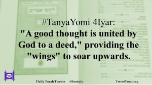 TanyaYomi #TanyaYomi 4Iyar Date: April 29, 2020Author: ysspitz #TanyaYomi 4Iyar: “A good thought is united by God to a deed,” providing the “wings” to soar upwards. Share this: Share on X (Opens in new window) X Share on Facebook (Opens in new window) Facebook Like Loading... Related