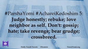#ParshaYomi #AchareiKedoshim 5: Judge honestly; rebuke; love neighbor as self. Don’t: gossip; hate; take revenge; bear grudge; crossbreed.